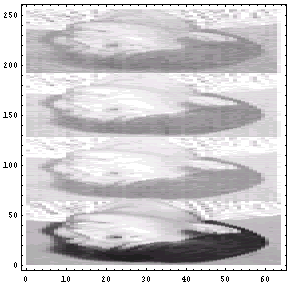 でも登場している。「エントロピーは増大するのみ...」というフレーズで有名なアレである。情報量を示す値だといっても良いだろう。せっかく、「ハードディスク...」の回で計算をしたのだから、今回もその計算を流用してエントロピーを計算してみたい。といっても、無記憶情報源(Zero-memorySource)モデルに基づけば、ヒストグラムが平坦すなわち各濃度の出現確率が等確率に近いほどエントロピーは高いのが当たり前であるが... この前作成したMathematicaのNotebookを流用するために、オリジナルと3つの変換画像を合体させる。そして、そのヒストグラムを見てみよう。このヒストグラムが非常にわかりにくいと思うので、一応説明しておく。あるY軸の値で水平に1ライン抽出して、その部分のヒストグラムを右のグラフに示しているのである。