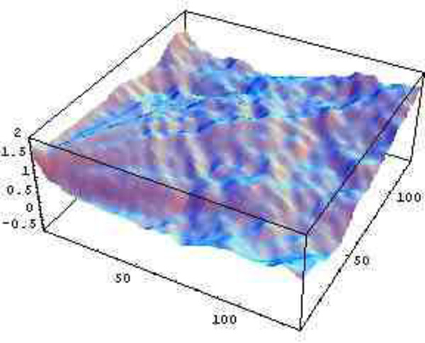 実際、表面が粗く波立った海面に太陽光が入射した時の反射光の分布を計算してみると、右の図のようになる(Modified - Blinn - Phong Model)。海面が微視的に色々な方向を向いているので、海面からの太陽光の反射は一方向のみに照射されるのでなく、色々な方向に向く。しかも、右の図は、まだ比較的表面が平らな場合の計算結果なので、実際の海面からの反射光はもっとさまざまな方向に広がる。