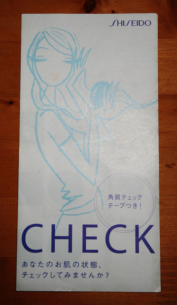 資生堂が「角質チェックテープつき!」という”あなたのお肌の状態チェックしてみませんか?”と謳いCHECKと名付けたリーフレットを配布している。このリーフレットには透明なテープが添付されている。粘着剤が付いた透明テープを頬につけて剥がし、黒い面に貼り付けて観察することで、顔の皮膚の角質の状態を診断することができる、というものだ。