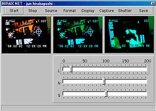ではインターネット上にある画像ファイルに対して、画像処理をかける「色覚モドキソフト」を作ってみた。コンピュータにネットワーク上のものが見える「色覚」を持たせて、ネットワーク上の画像について考えてみたわけだ。そして、ではそれを自分のPCの中にある画像ファイルをいじるようにしてみた。つまり、コンピュータに自分の中のものが見える「色覚」を持たせて、自分の中を覗いてみたのである。そして、今回はPCに接続されているビデオカメラを用いて、コンピュータに現実社会を眺める「色覚」を持たせてみることにしたのである。そんな現実社会を眺めることができて個性を持つコンピュータを通して、現実社会を眺めてみたいと思うわけだ。