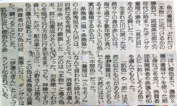 (中略) (エサに入れた色素で養殖のサケの身の色を調整するために)消費者が好む色は何色か、調べることにした。…最多得票は、天然にはない「(肌色と赤の)中間色」だった。